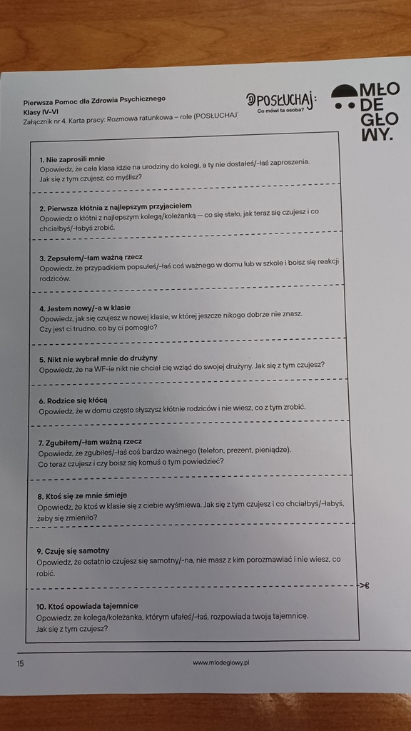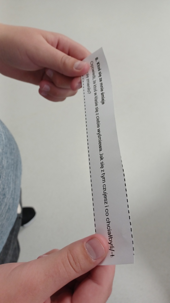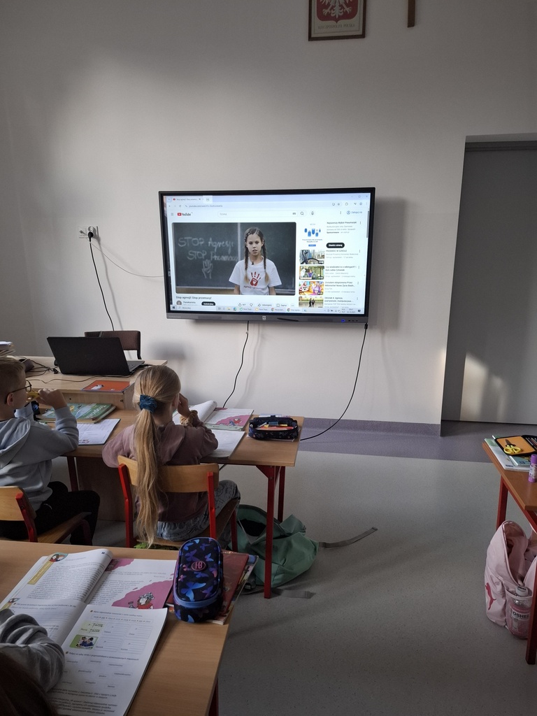 Z kolei uczniowie klas starszych spotkali się podczas lekcji wychowawczych z panią psycholog i wysłuchali prelekcji na temat przeciwdziałania przemocy rówieśniczej, cyberprzemocy. Podczas różnych lekcji zostały przeprowadzone warsztaty, ćwiczenia z wykorzystaniem materiałów udostępnionych przez Ministerstwo Edukacji Narodowej: przygotowywali scenki rodzajowe, krótkie wystąpienia, podczas których wcielali się w osoby pokrzywdzone, opowiadali o swoich uczuciach i emocjach. Stworzyli murale pozytywnych emocji, a sama praca nad nimi (w zespołach) dostarczyła im wiele radości.