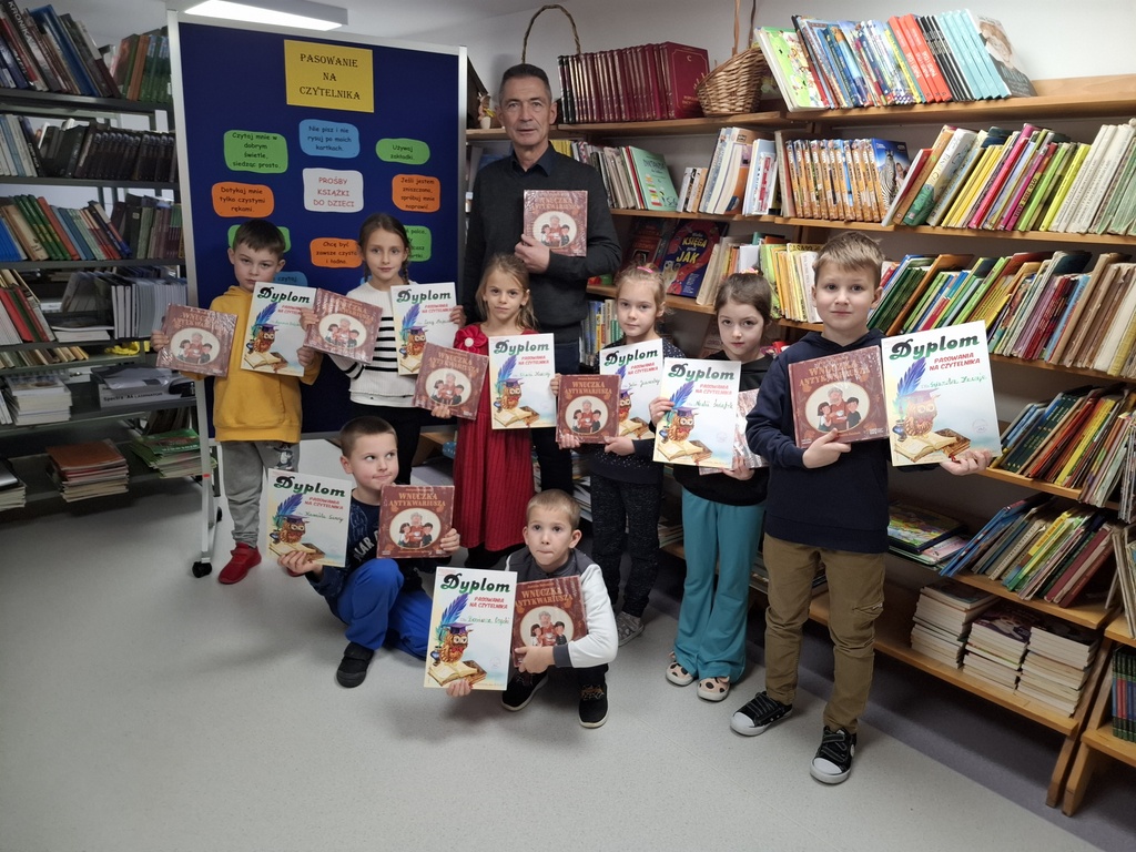 Niezwykle budujący okazał się fakt, że pierwszoklasiści z ogromnym entuzjazmem opowiadali o swoich domowych biblioteczkach oraz tradycjach czytania w domach – z rodzicami, dziadkami i samodzielnej lekturze książek. Po takim wprowadzeniu Pan Dyrektor, Bolesław Buratowski, dokonał pasowania uczniów, którzy oficjalnie wstąpili do grona czytelników. Na pamiątkę tego wydarzenia każdy uczeń otrzymał okazjonalny dyplom oraz książkę ,,Wnuczka antykwariusza” autorstwa Justyny Bednarek, w opracowaniu graficznym wybitnej ilustratorki Emilii Dziubak, a rodzice broszurę instruktarzową informującą o korzyściach wynikających ze wspólnego, rodzinnego czytania. Wyprawki Czytelnicze pierwszoklasiści dostali w ramach tegorocznej odsłony kampanii „Mała książka – wielki człowiek” realizowanej przez Instytut Książki i Ministerstwo Kultury i Dziedzictwa Narodowego od 2017 roku.