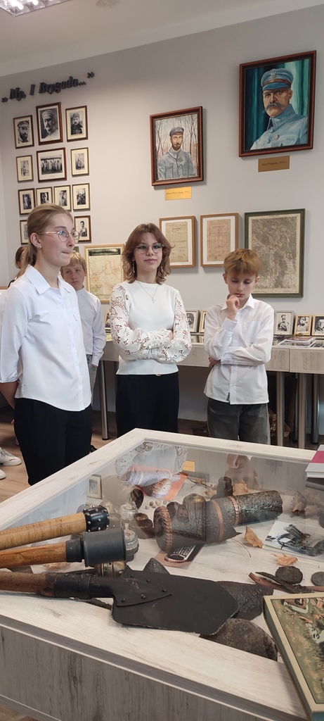 Po zakończonych zmaganiach konkursowych uczestnicy mieli możliwość zwiedzenia szkolnej izby pamięci. Oprowadziła ich po niej pani przewodnik, która w ciekawy i przystępny sposób przybliżyła historię Legionów Polskich oraz opowiedziała o lokalnych bohaterach związanych z okresem I wojny światowej.