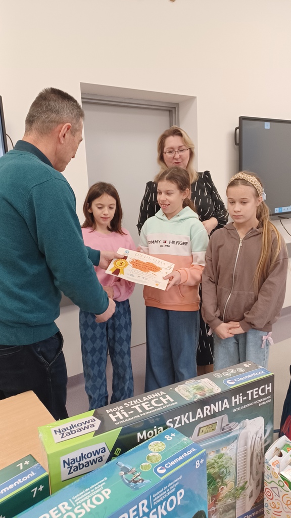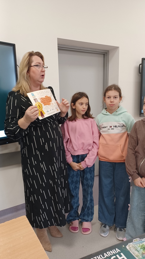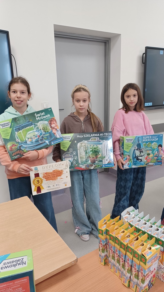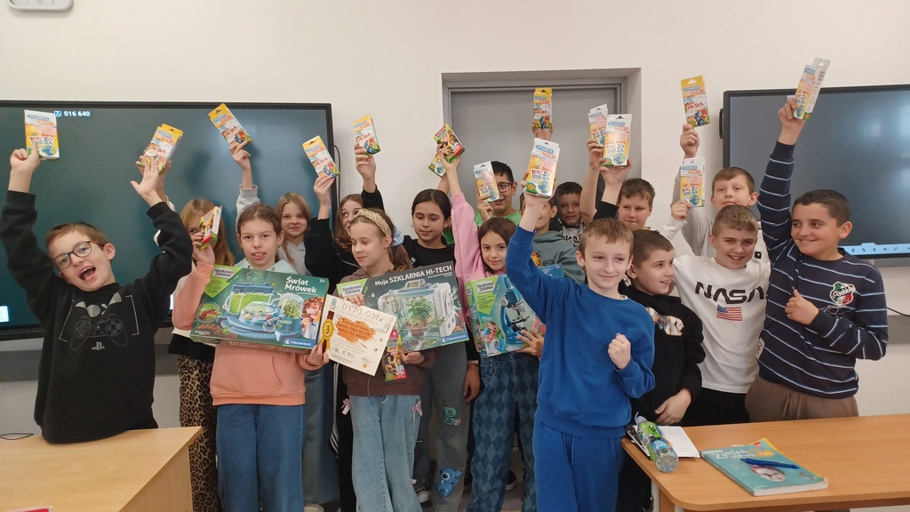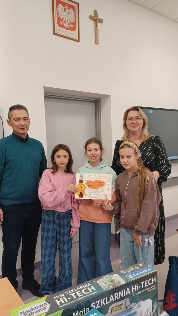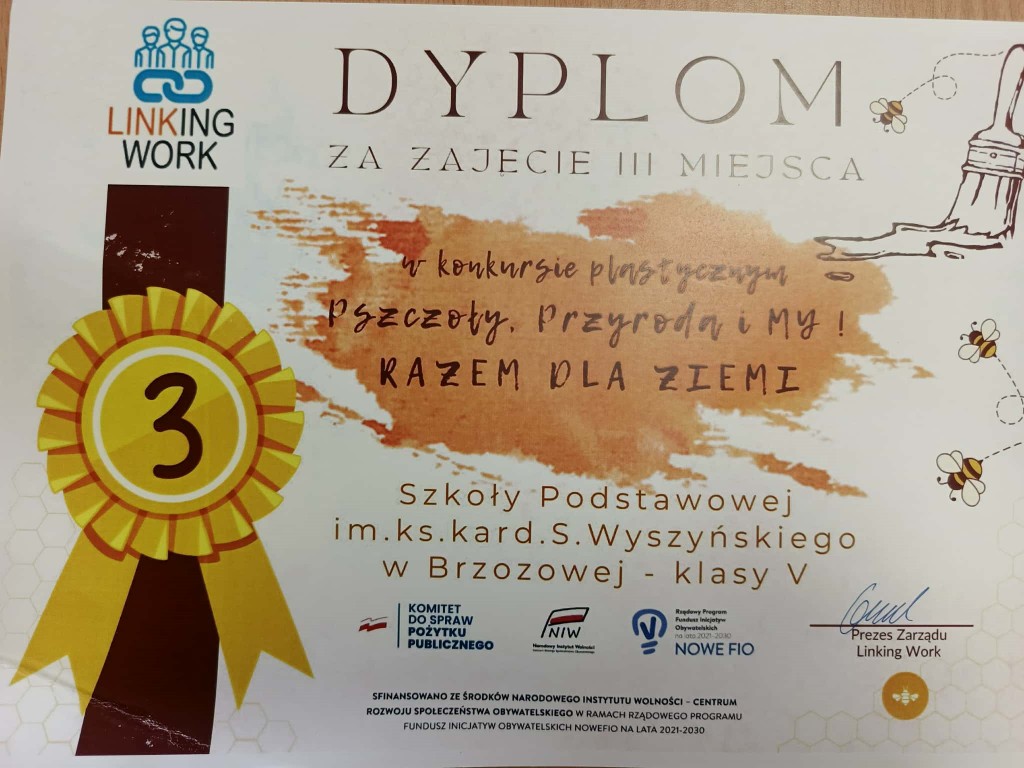 W dniu 1 grudnia 2025 r. klasa V odebrała nagrody za zajęcia III miejsca w konkursie plastycznym „Pszczoły, Przyroda i My. Razem dla Ziemi”. Szczególne uznanie należy się uczennicom, które przygotowały pracę konkursową: Alicji Sadowskiej, Emilii Kuczaj oraz Amelii Jasnocha. Klasa otrzymała dyplom, który stanowi ogromne wyróżnienie i motywację do dalszej pracy twórczej. Dodatkowo nasza szkoła otrzymała 60 roślin miododajnych, dzięki którym wzbogacimy szkolny ogród i pomożemy lokalnym zapylaczom.